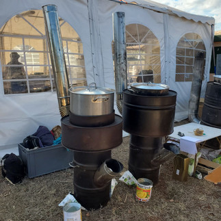Une tente pour accueillir des débats, un espace de repos, une lignée de rocket stove (foyers à bois) pour cuisiner...